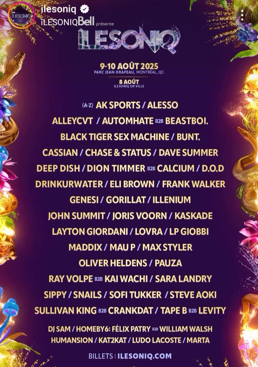 Tickets for ILESONIQ 2025 are on sale now at ILESONIQ.COM. Don’t miss your chance to be part of this epic celebration of music and culture. Join thousands of fellow music enthusiasts as we come together to experience the magic of ILESONIQ. Get your tickets now and prepare for a weekend of pure sonic bliss! The full lineup, in alphabetical order, includes: AK Sports, Alesso, Alleycvt, Automhate B2B Beastboi., Black Tiger Sex Machine, Bunt., Cassian, Chase & Status, Dave Summer, Deep Dish, Dion Timmer B2B Calcium, D.O.D, Drinkurwater, Eli Brown, Frank Walker, Genesi, Gorillat, Illenium, John Summit, Joris Voorn, Kaskade, Layton Giordani, Lovra, LP Giobbi, Maddix, Mau P, Max Styler, Oliver Heldens, Pauza, Ray Volpe B2B Kai Wachi, Sara Landry, Sippy, Snails, Sofi Tukker, Steve Aoki, Sullivan King B2B Crankdat, Tape B B2B Levity, DJ Sam, Homeby6: Félix Patry B2B William Walsh, Humansion, Kat2kat, Ludo Lacoste, and Marta. Get ready for an unforgettable experience at ILESONIQ 2025!